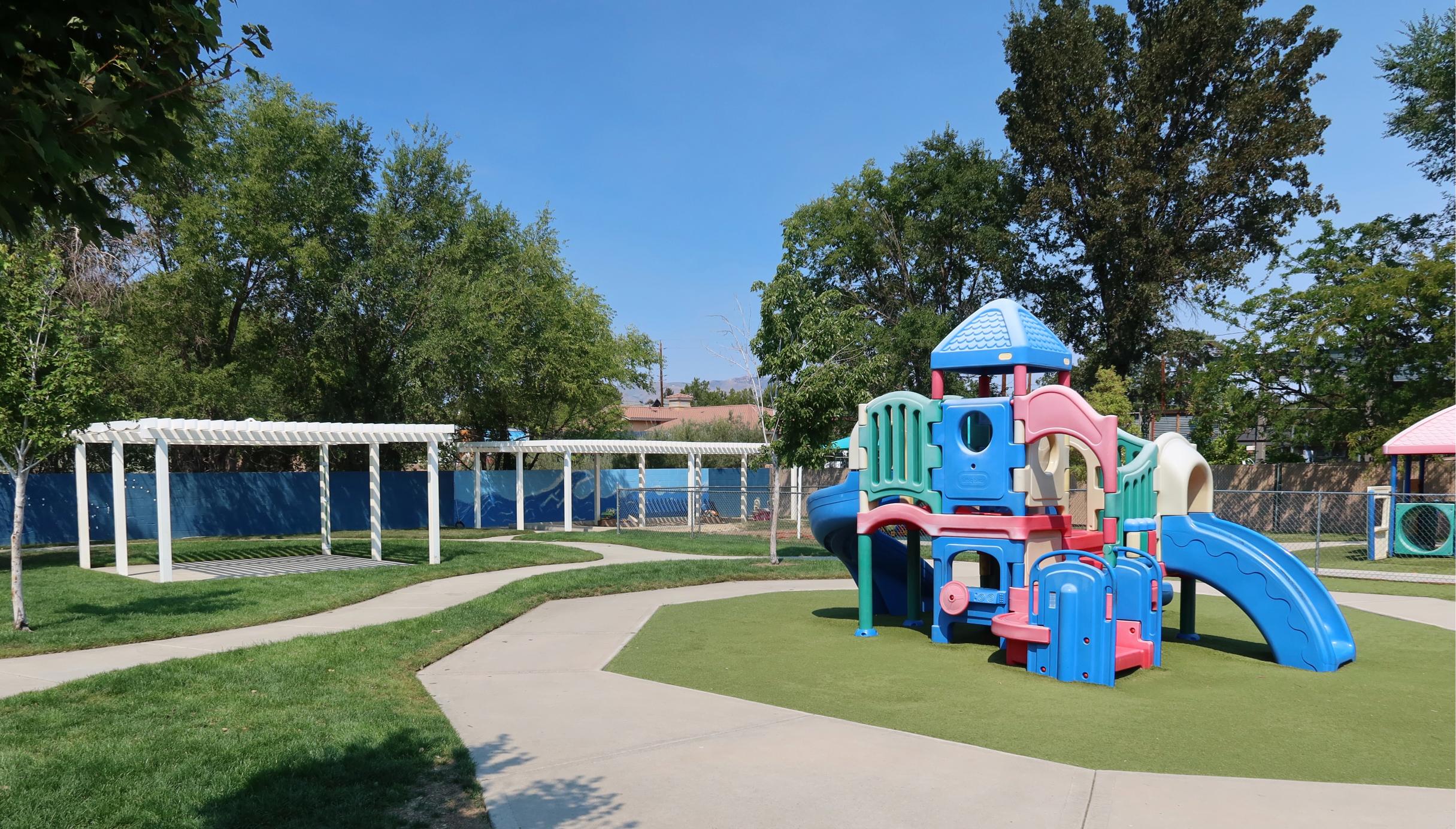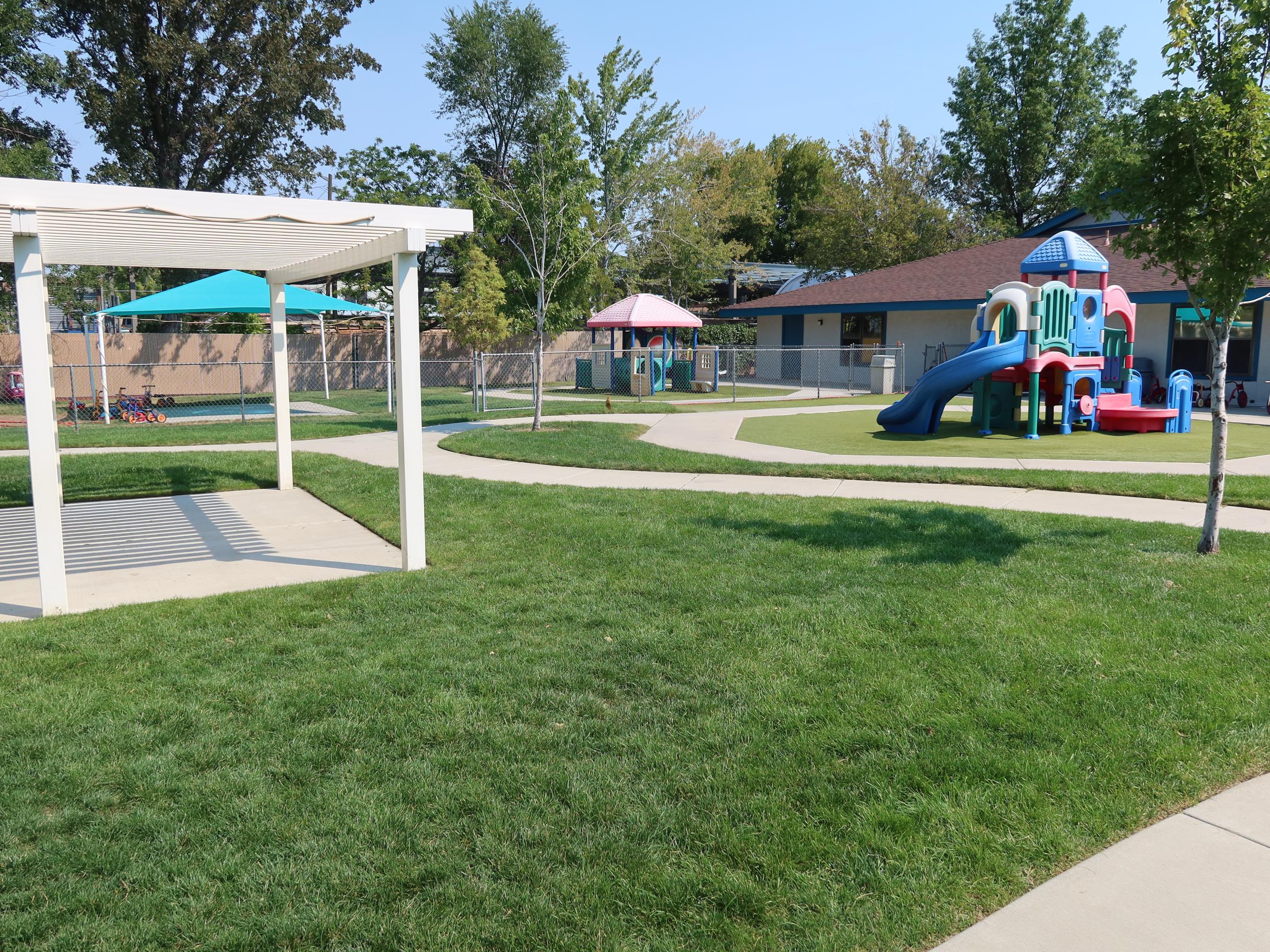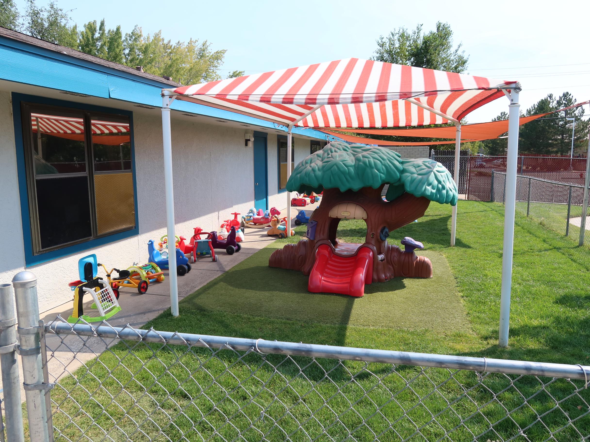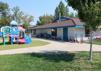 Outside we have three large areas to play separated for different age groups! Our playgrounds are expansive, landscaped areas with large sandboxes, play structures for climbing and endless sidewalks for tricycle riding.